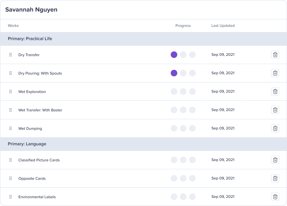 Capture daily notes, photos, and works; print progress reports; and keep class lists organized, all in one Montessori-focused workspace.